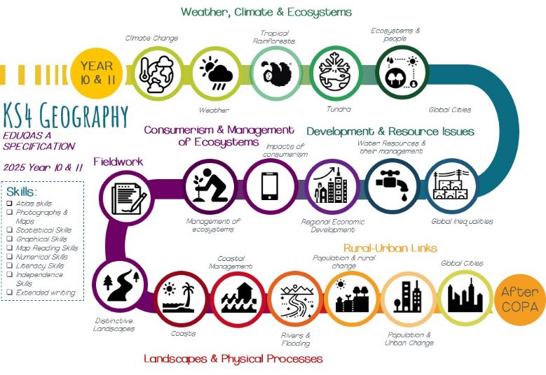 Pupils will study a broad curriculum whilst developing the ability to think "like a geographer". Students will develop skills to conduct enquiries in the classroom and in the 'field' in order to develop their understanding of specialised geographical concepts and current geographical issues. These include rivers, coasts, tectonic hazards, weather, climate, ecosystems, development and rural to urban links.